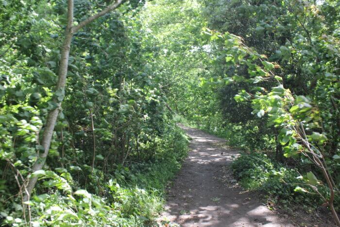Llwybr yn mynd trwy lystyfiant ar Safle o Bwysigrwydd er Cadwraeth Natur y Gored Ddu. Llun gan: Cyngor Caerdydd